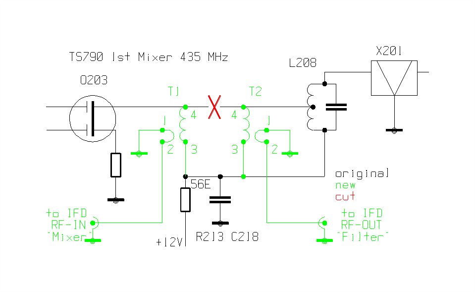 Modifications IFD option TS790: Oscillator: quartz TQ730518 / 65,225 MHz for IF 75,925 MHz (standard), R80: 560Ohm, L80: 0,33 uH, C80: 22pF, C81: 33pF, C82: 33pF. Values for the band filter: C10: 68pF, C11: 12pF, L12: 0,33uH, C12: 2.2pF, (C13: 2,7pF), L13: 0,33uH, C14: 22pF, C15: 22pF.