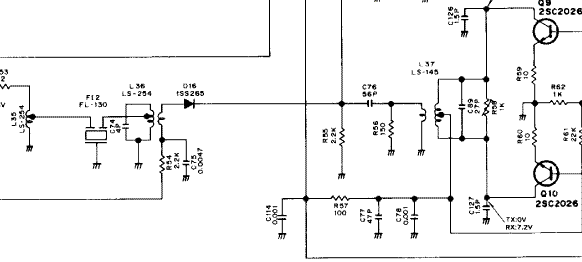 The 'mixer' cable leading to the mixer shows a very low resistance (ohmmeter) of 2-5 Ohm to ground. Measuring the 'filter' cable leading to the xtal-filters via two switching diodes shows approx. 2 kOhms.